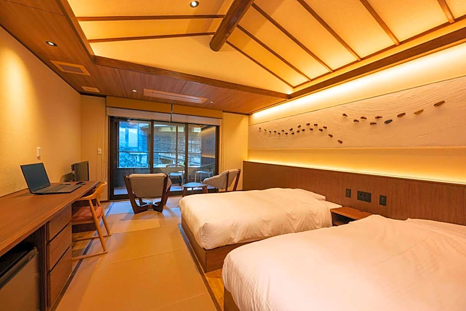 The twin room includes a shared bathroom equipped with a hairdryer. The spacious twin room provides air conditioning, tatami, a safe deposit box, heating, as well as a TV with satellite channels. The unit offers 2 beds.